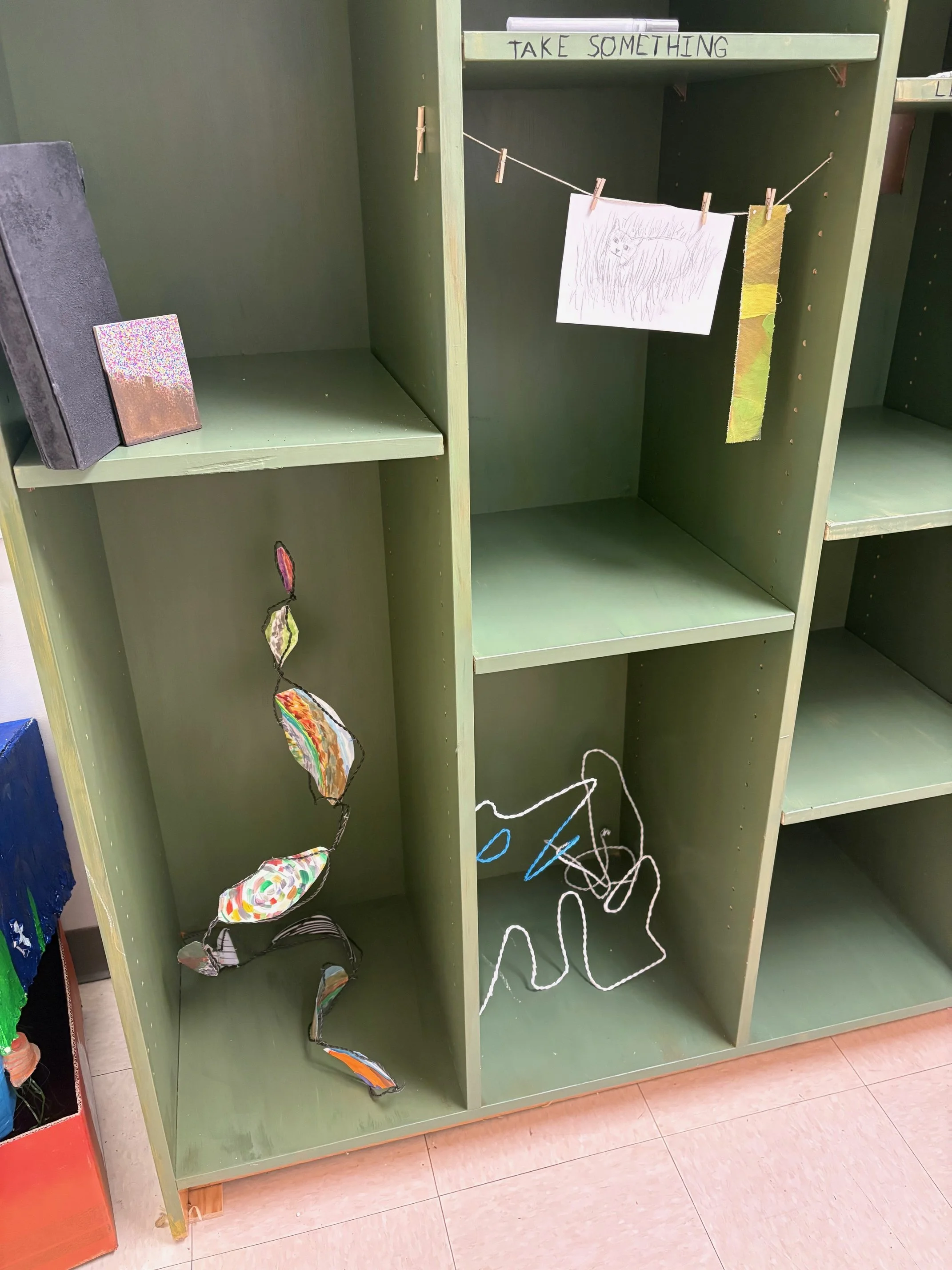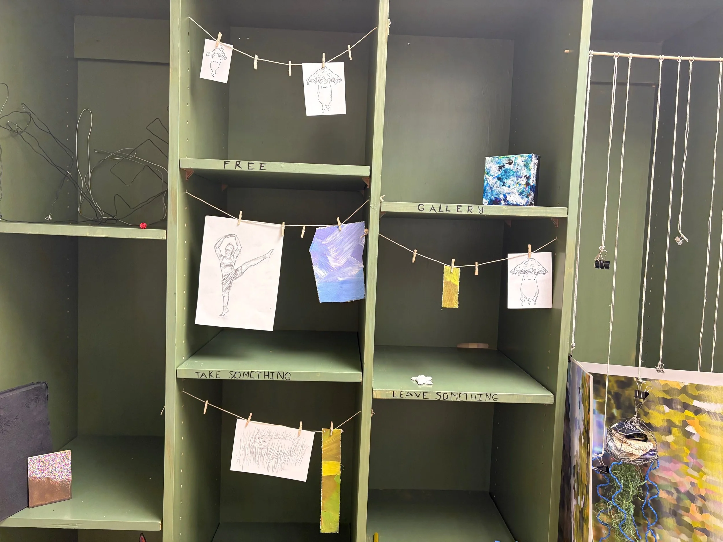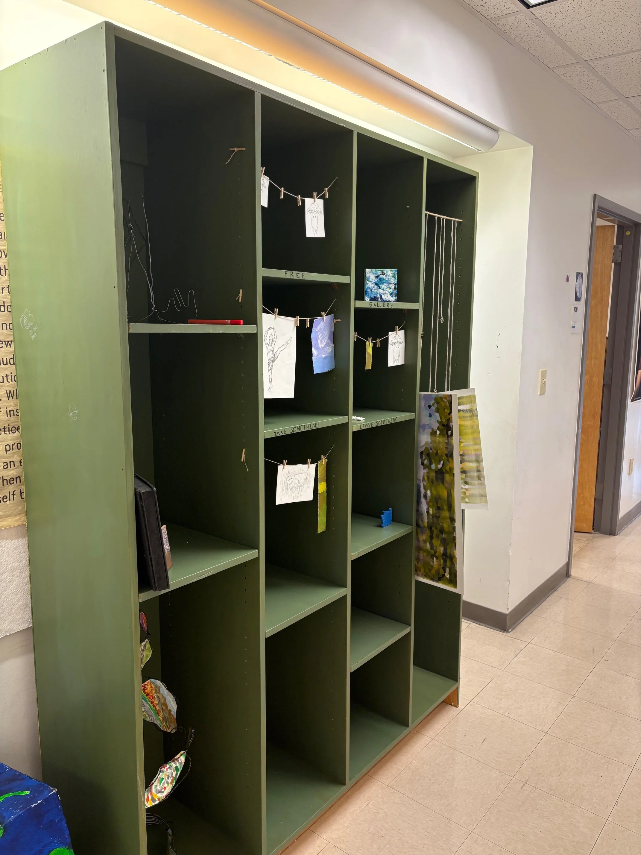 In my opinion, some of the most interesting things stem from collaboration. In the art department, the semetsers always end with so many discarded projects. Things students did for class that they don’t want to keep, and usually will discard. What if there was something they could do with those projects? I borrowed a bookshelf from one of my professors, painted it green, and placed it in a well trafficked part of the hallway. Plenty of clips to hang things with, and shelves to put things on. I wrote “Free Gallery, Take Something Leave Something” on it, left the paint markers on the shelf, and walked away. I was delighted to see people leave their unwanted projects there, to see people take things they found interesting, and most of all I was delighted to see people discover the paint markers and leave graffiti on the shelf. The shelf held peoples art, and became art itself.