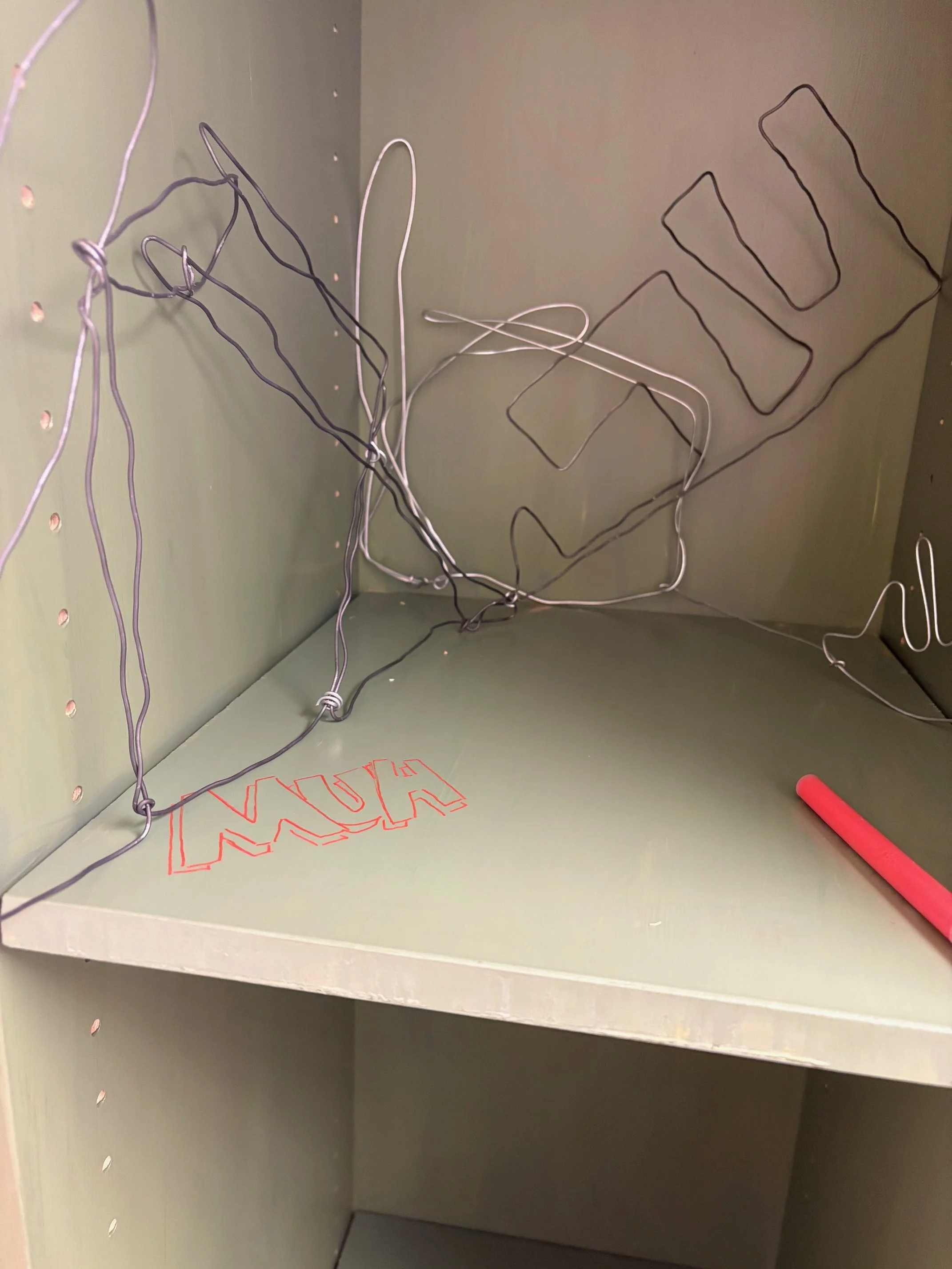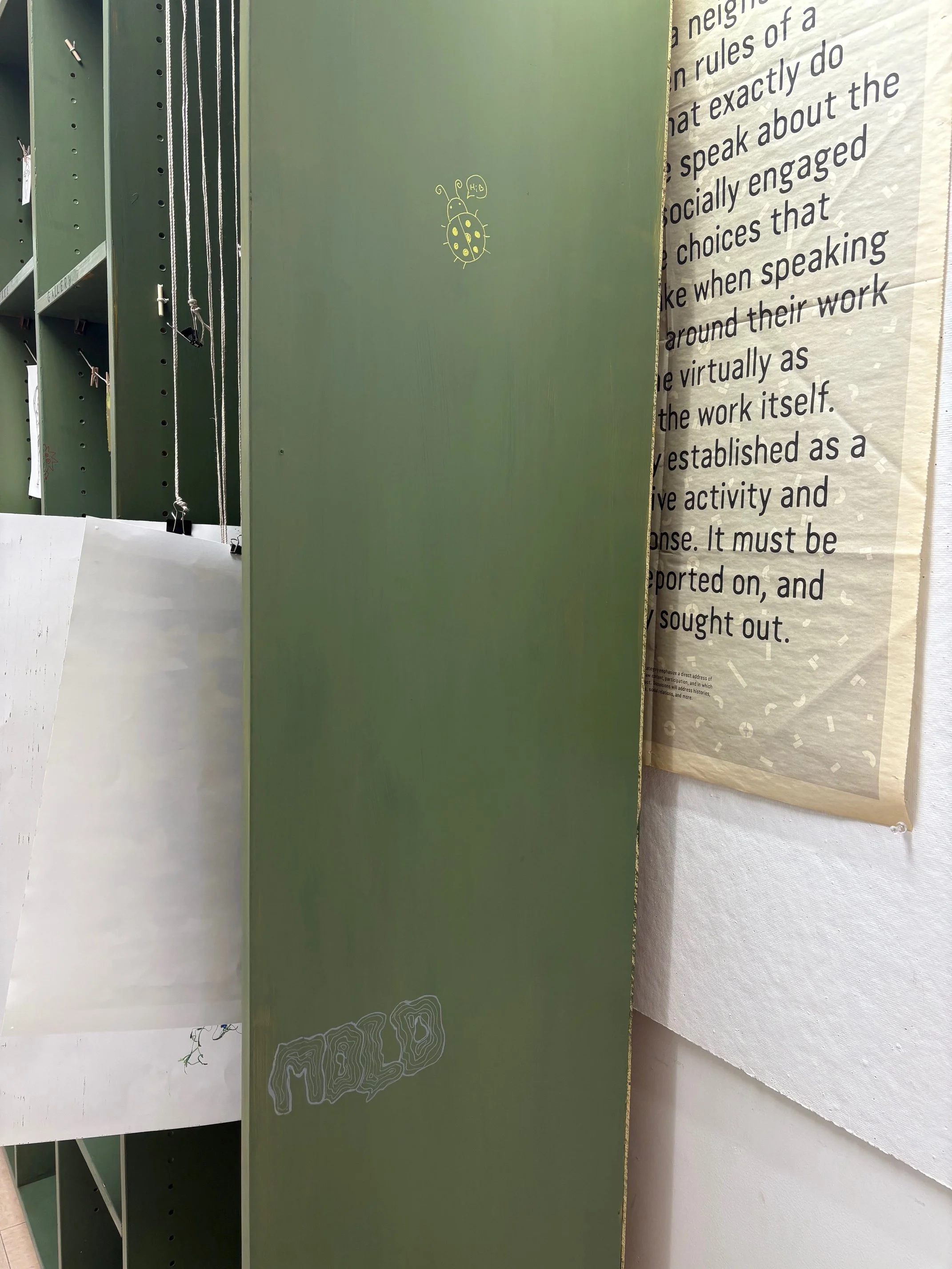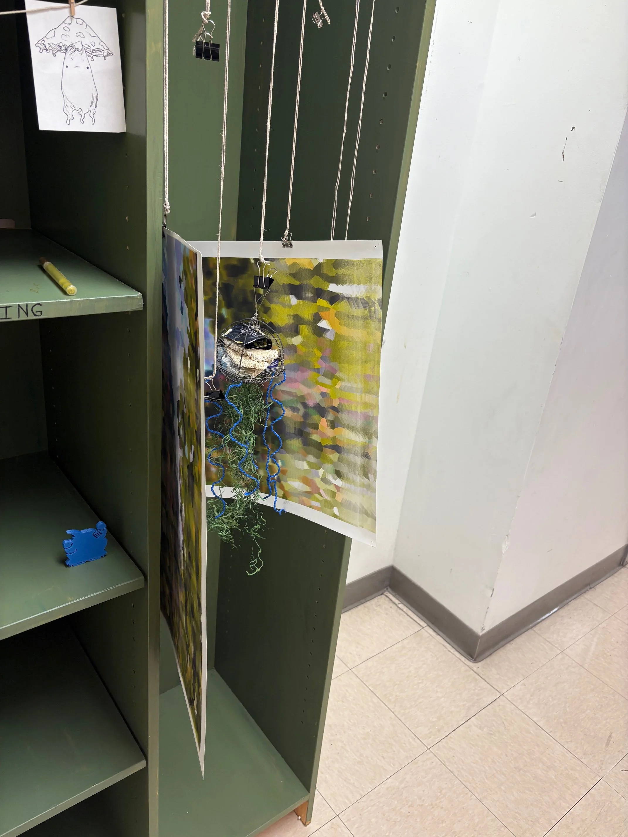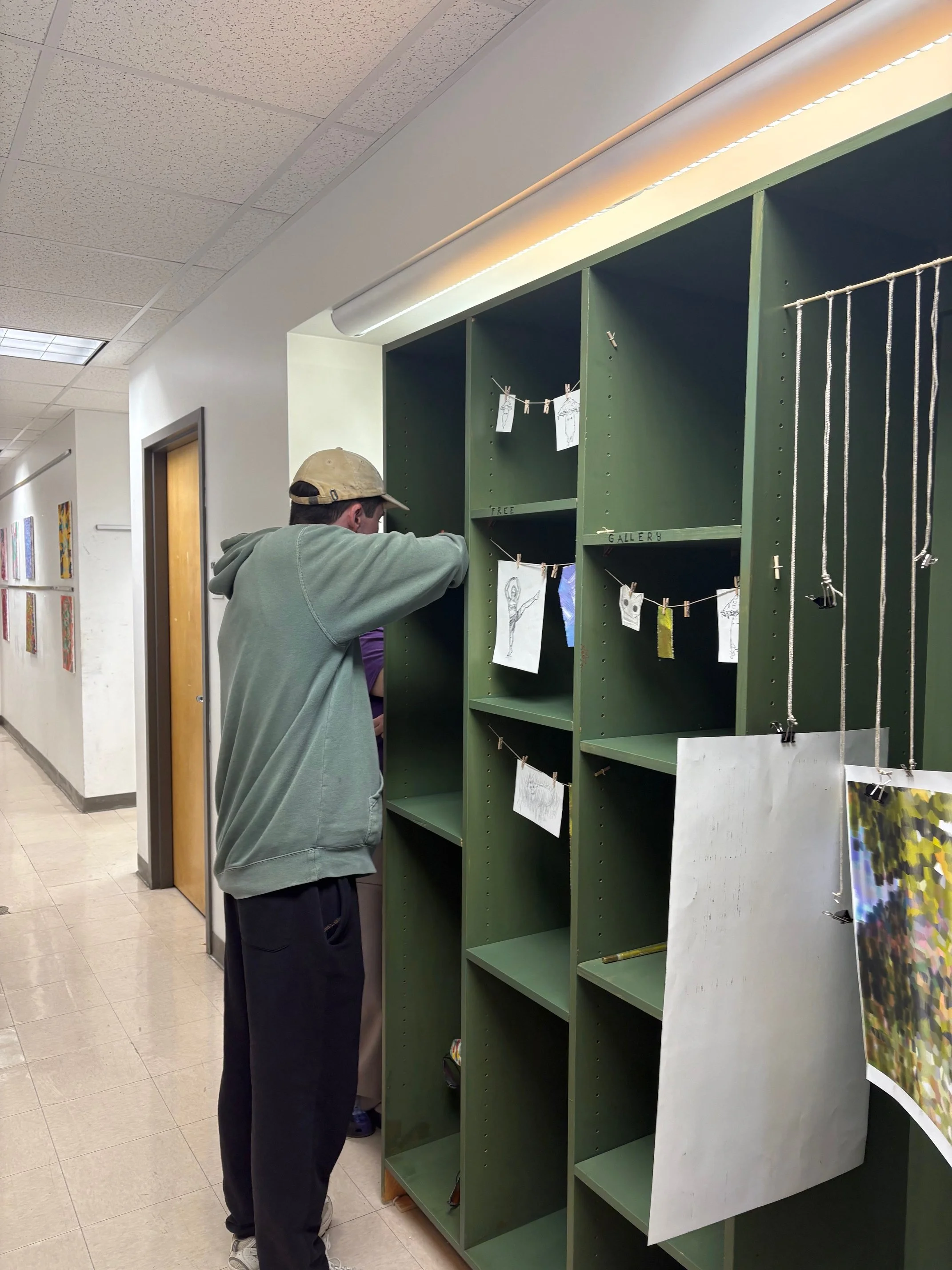 In my opinion, some of the most interesting things stem from collaboration. In the art department, the semetsers always end with so many discarded projects. Things students did for class that they don’t want to keep, and usually will discard. What if there was something they could do with those projects? I borrowed a bookshelf from one of my professors, painted it green, and placed it in a well trafficked part of the hallway. Plenty of clips to hang things with, and shelves to put things on. I wrote “Free Gallery, Take Something Leave Something” on it, left the paint markers on the shelf, and walked away. I was delighted to see people leave their unwanted projects there, to see people take things they found interesting, and most of all I was delighted to see people discover the paint markers and leave graffiti on the shelf. The shelf held peoples art, and became art itself.
